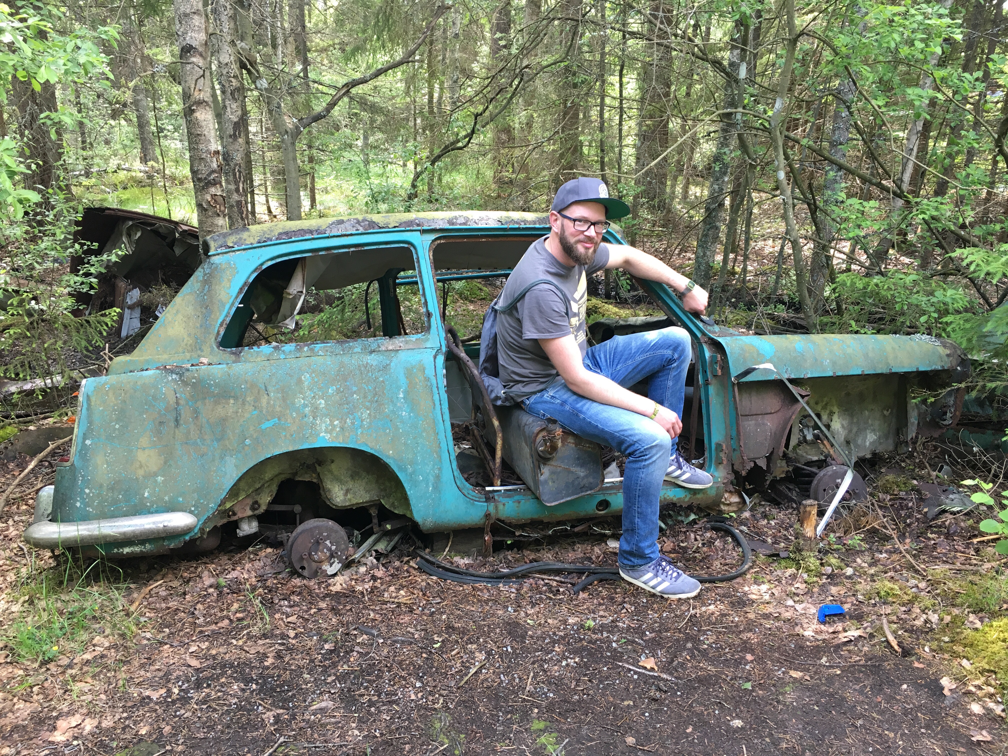 Zunächst erfüllten wir unsere Tagesaufgabe und besuchten einen Autofriedhof. Wir sollten ein Wrack finden, das unserem Rallyemobil ähnlich sieht und uns davor fotogragieren lassen. Wir fanden einen Hochdachkombi, dessen verwitterte, moosbewachsene Karosserie auch farblich unserem Wagen entspricht.