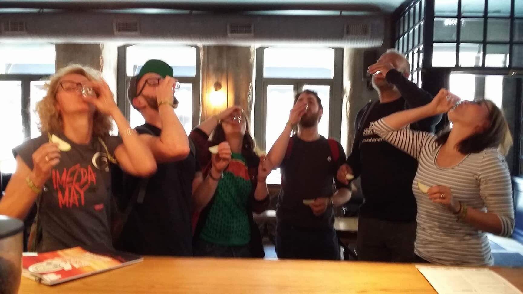 Kugelrund waren wir gewappnet, die eigentliche Tagesaufgabe von heute zu erfüllen. Wir sollten eine Bar finden, dort ein Codewort nennen und im Gegenzug einen Aufkleber erhalten. Zum Glück gab es dort auch das ein oder andere Getränk, denn wir waren natürlich durstig nach unserem Abendmahl. Ermutigt fielen wir in einen Fotoautomaten ein.