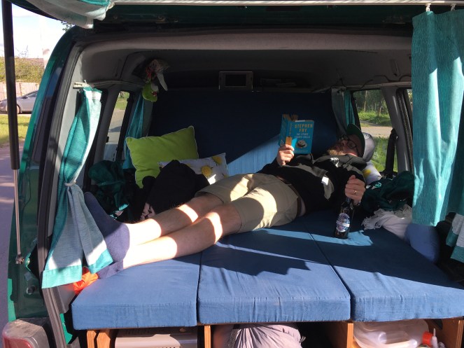 Danach machte es sich Robert in der in unserem fahrbaren Schlaf- und Wohnzimmer gemütlich, las ein Buch, schaute eine DVD und erholte sich davon bei einem Nickerchen.
